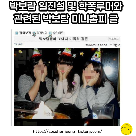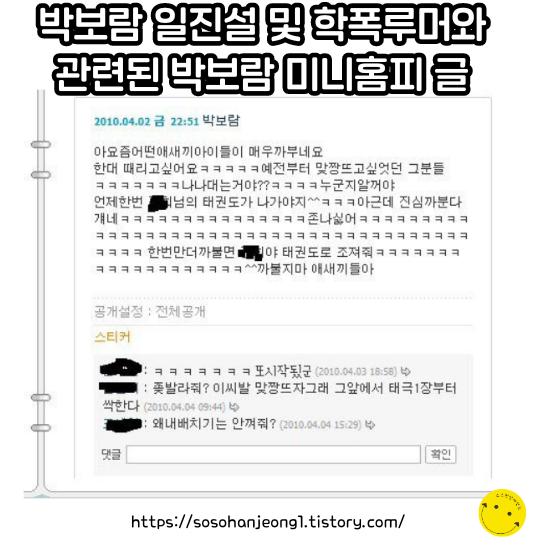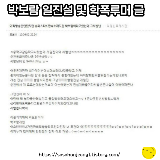 2010년 슈퍼스타K2로 인기가 높아지자 일각에서는 그녀의 과거에 관한 많은 루머가 생산되었습니다. 박보람 개인 미니폼이에 이를 뒷받침을 여러 자료들이 남아있는 상태입니다. 이런 그녀의 일진설은 그녀가 슈퍼스타K2가 끝난 후 일부 참가자들이 출연한 '비틀스 코드'에서 일진설에 대해 해명하기도 했으니 이 이후 박보람 본인과 소속사의 별다른 대응이나 조치가 이루어지지 않아 많은 네티즌으로부터 당시 많은 비난을 받기도 했습니다.