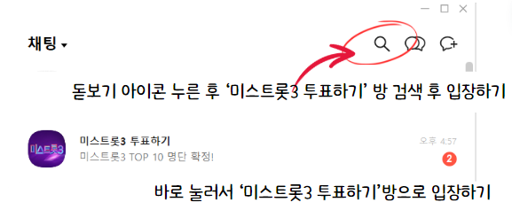 확인 후 누른 후 '미스트롯 3 투표하기' 방으로 바로 입장하거나 돋보기 모양을 눌러 '미스트롯 3 투표하기'방을 찾아 들어간다