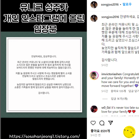 논란이 일어난 지 한 달이 지난 2일 성주는 개인 인스타그램에 "최근 온라인 커뮤니티 및 인스타그램을 통해 갑작스러운 소식으로 많은 분들을 놀라게 하고 솔직하게 제 자신을 보여드리지 못한 점에 대해 죄송하다"는 글을 남겼다. 덧붙여