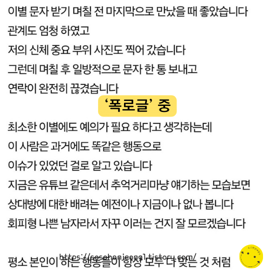 글이 게재된 22일 이후 네티즌은 단순하게 연인 관계에서 헤어졌다고 하더라고 이별의 방식이 상대방에 대한 배려가 없다는 의견과 함께 신체 부위를 불법 촬영한 사실에 대해 분개했다. 이 과정에서 "배우 L"."문자이별" 등 특징 단어들을 연관시켜 폭로글의 주인공으로 "이서진"을 지목했고 그가 이전에 출연했던 방송 중 일분 장면을 편집하여 폭로글 속 남자와 유사하다는 의견을 모았다.